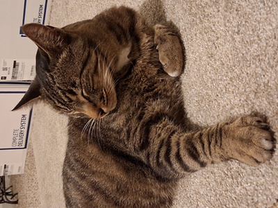 Notes: The cat is very social and appears well cared for. Appears to be a tabby. Appears neutered.